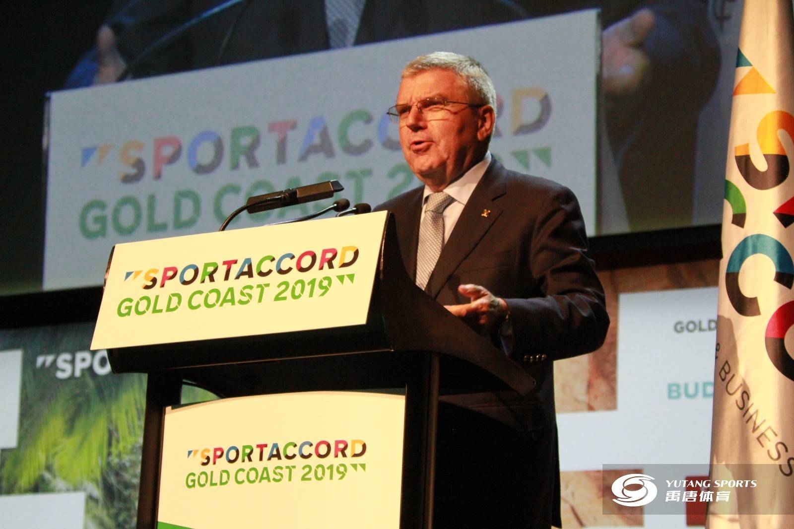 时任国际奥委会主席托马斯·巴赫在2019年世界体育大会现场发言,图片来自禹唐体育